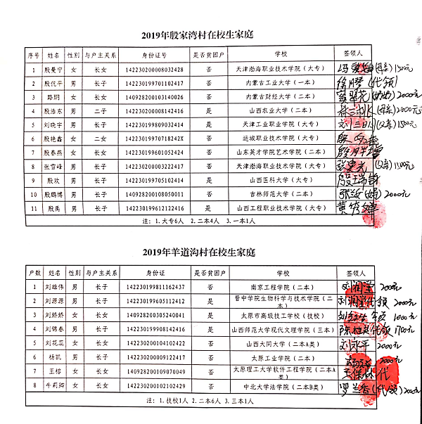 經(jīng)統(tǒng)計(jì),2019年以殷家灣村和羊道溝村為生源地的在讀生共19人,省安投公司對(duì)幫扶村的19名在校生給予34200元助學(xué)金(一本助學(xué)金2500元/人,二本助學(xué)金2000元/人,三本助學(xué)金1700元/人,大專助學(xué)金1500元/人,職高助學(xué)金1000元/人),并建立長(zhǎng)效機(jī)制。